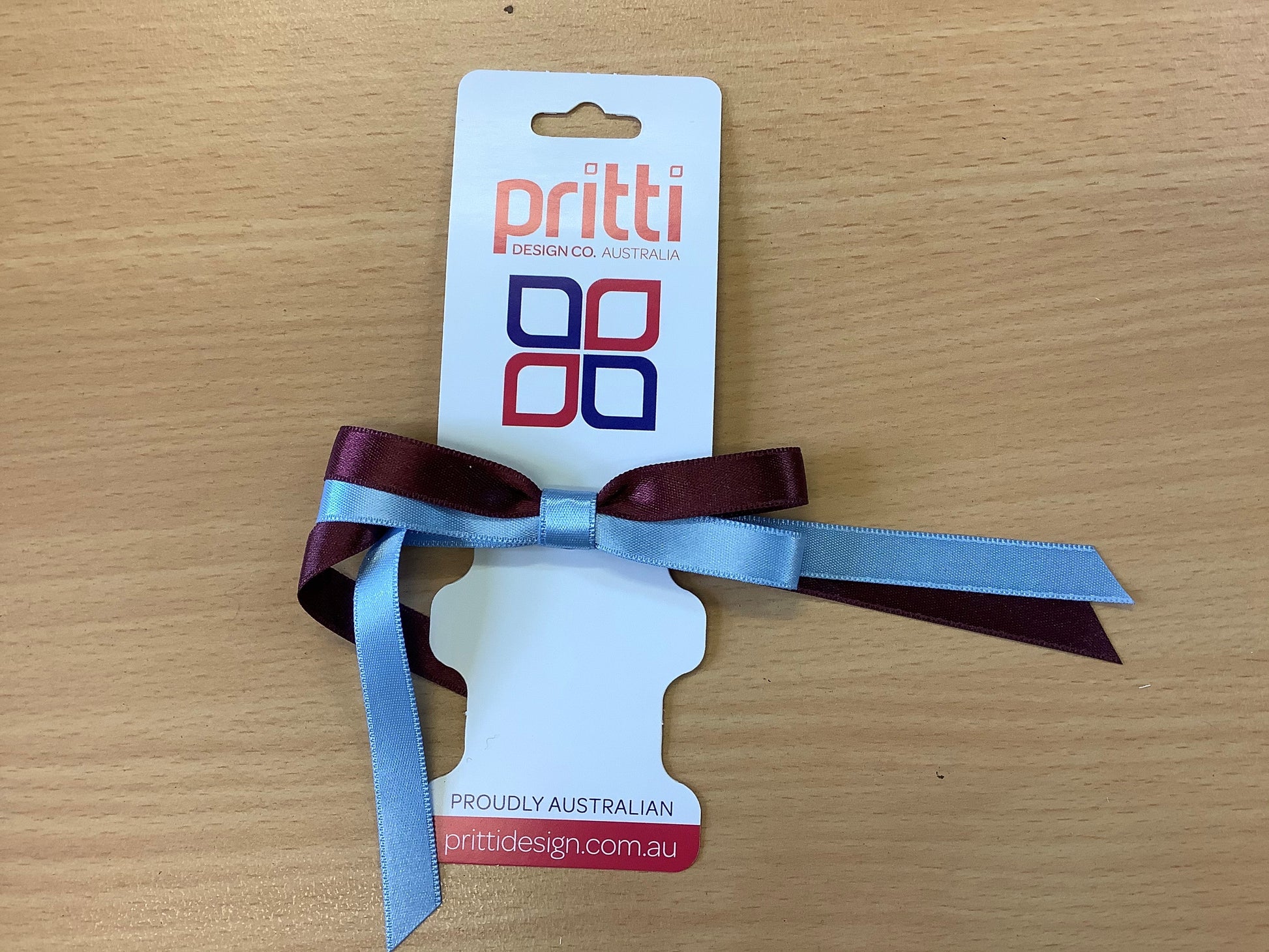 This is a great school hair ribbon. A ready tied ribbon that will have the bow in your hair perfect every time. It is a perfect accessory to add the final touch to a pony tail. This comes in the primary school colours: Burgundy and Sky.