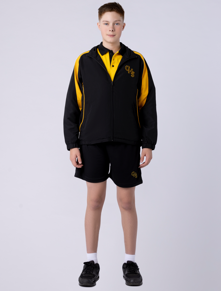 The Track Jackets are one half of the Concord High School track suit. They are made from black and yellow polyester fabric with a loose nylon fleece inner layer, with a logo on the left chest. This garment is cost effective way to keep the athlete warm around the times they are performing. They are a relaxed fit designed to fit both male and female growing bodies. As well as being made with industry leading YKK zippers. They are to be worn with the the Polo Shirt, Sport Shorts and Track Pants.