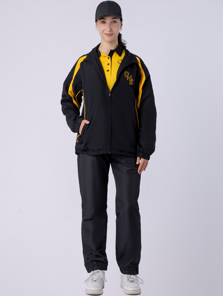 The Track Pants are one half of the Concord High School track suit. They are made from black and yellow polyester fabric with a loose nylon fleece inner layer, with a logo on the left chest. This garment is cost effective way to keep the athlete warm around the times they are performing.